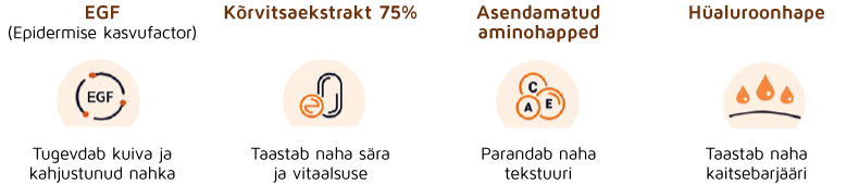 • Taastav seerum kõikidele nahatüüpidele, eriti peale tugevaid hooldusi, nagu keemiline koorimine ja laser jne.
