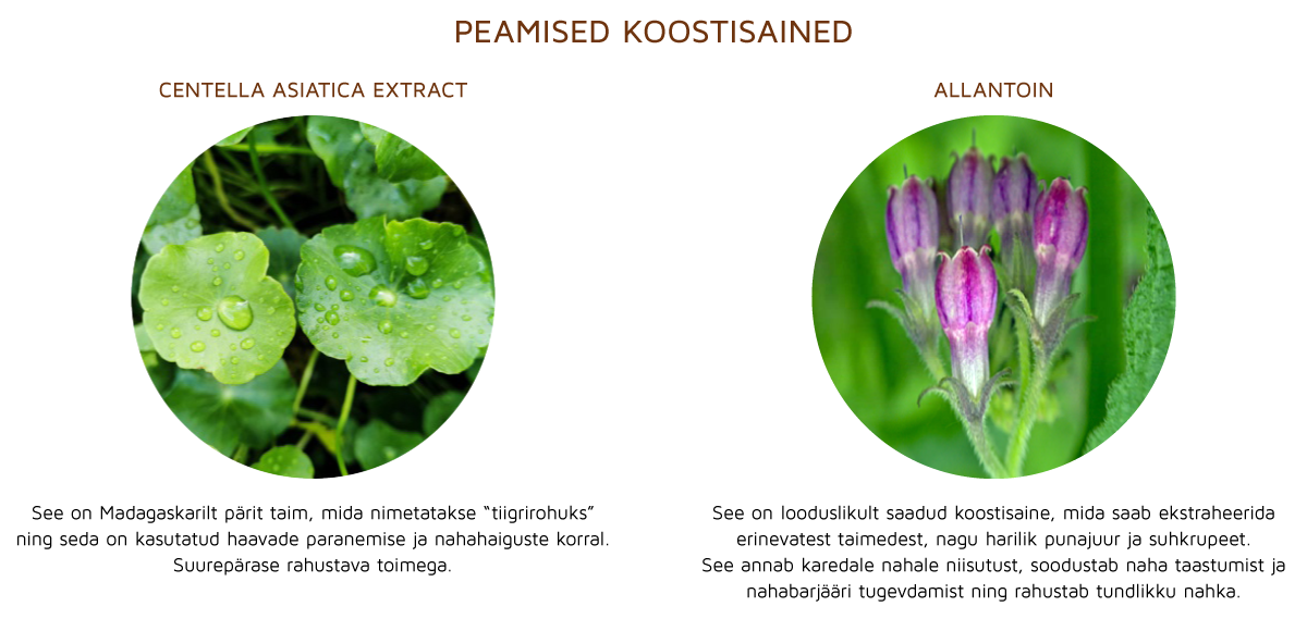 Koostisained: Kolme erineva hüaluroohappe kompleks, nahka taastav cica kompleks.